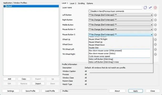 - دعم جميع أنواع الفأرات: إذا كنت تستخدم فأرة غير معروفة ولا تأتي مع برنامج خاص لتعديلها أو إذا كنت ترغب في إضافة ميزات جديدة إلى فأرتك بغض النظر عن نوعها يمكنك الاستعانة بهذا البرنامج الذي يدعم كل الفئران المتاحة سواء كانت USB أو لاسلكية أو حتى الفأرات الخاصة بأجهزة الكمبيوتر المحمولة، ولا يتطلب البرنامج بعد تنزيله تثبيت برامج أخرى لتعريف الفأرة لأنه يحتوي على ملفات مدمجة لكل أنواع وأشكال الفئران المتوفرة.